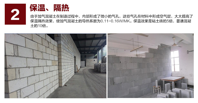 2、 保溫、隔熱:由于加氣混凝土在制造過程中,內部形成了微小的氣孔,這些氣孔在材料中形成空氣層,大大提高了保溫隔熱效果,使加氣混凝土的導熱系數為0.11-0.16W/MK。保溫效果是粘土磚的5倍,普通混凝土的10倍。