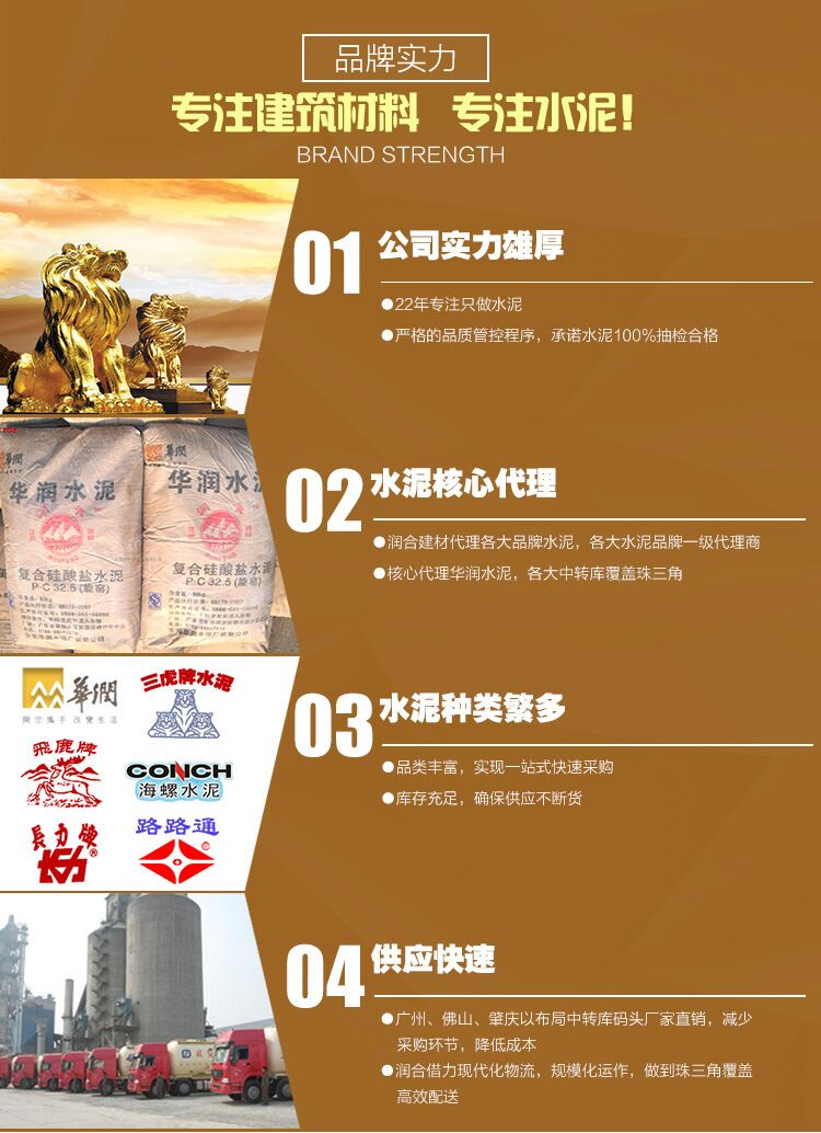 佛山市潤合建材公司 簡稱:廣東潤合。專注水泥22年生產/批發。主營:PC32.5R、PO42.5R、P1142.5R、PO52.5R華潤水泥、三虎水泥、海螺水泥、飛鹿水泥、路路通水泥、長力水泥。及C20、C25、C30、C35、C40、等C60以下混凝土。各大水泥品牌,在水泥采購商中享有較高的品質認可,廣東潤合與多家世界500強企業中鐵、中交、中國建筑和知名房企保利地產、碧桂園地產、龍光地產、美的地產長期合作。各品牌水泥有較大價格優勢,及水泥運輸配送優勢。佛山潤合水泥建材公司,將以薄利多銷及全心全意服務每位客戶。